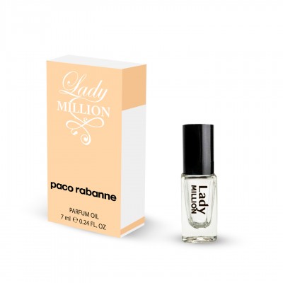 Духи масляные для женщин 7 мл.. «Lady Million» - это уникальные, экстравагантные и чувственные духи, воплотившие в себе очарование, роскошь и шик. Идея создания композиции, захватывающей дух, навеяна популярными мужскими духами 1 Million. Мастера бренда Paco Rabanne решили, что настоящего мужчину, конечно же, должна сопровождать прекрасная «женщина на миллион». Lady Million – блистательный, ультра женственный и экстравагантный аромат, созданный Домом PACO RABANNE для ослепительно роскошных, соблазнительных леди «на миллион». Женщина «Lady Million» в высшей степени женственная, решительная и невероятно смелая, обладающая творческим, жизнерадостным и свободолюбивым характеромАвторство принадлежит Анне Флипо, Доминик Ропьонк и Беатрисе Пике. Они представили парфюм, который вдохновлен роскошью, золотом и богатством. В нем доминируют невероятная чувственность и элегантность. Флакон выполнили не в виде массивного слитка золота, как в мужской версии аромата, а в форме алмаза, покрытого золотом. Не отказывайте себе в удовольствии! Попробуйте шикарный аромат Paco Rabanne Lady Million! Современные классификаторы относят данную парфюмерную композицию к классам цветочных и фруктовых. Трепещущая и чувственная, Lady Million представляет собой свежий цветочный аромат с древесным оттенком, подобный нектару чувственных цветов, оставляющему тонкий и при этом очень ощутимый след. Самыми узнаваемыми оттенками их произведения стали: в начальных нотах - малина, нероли и